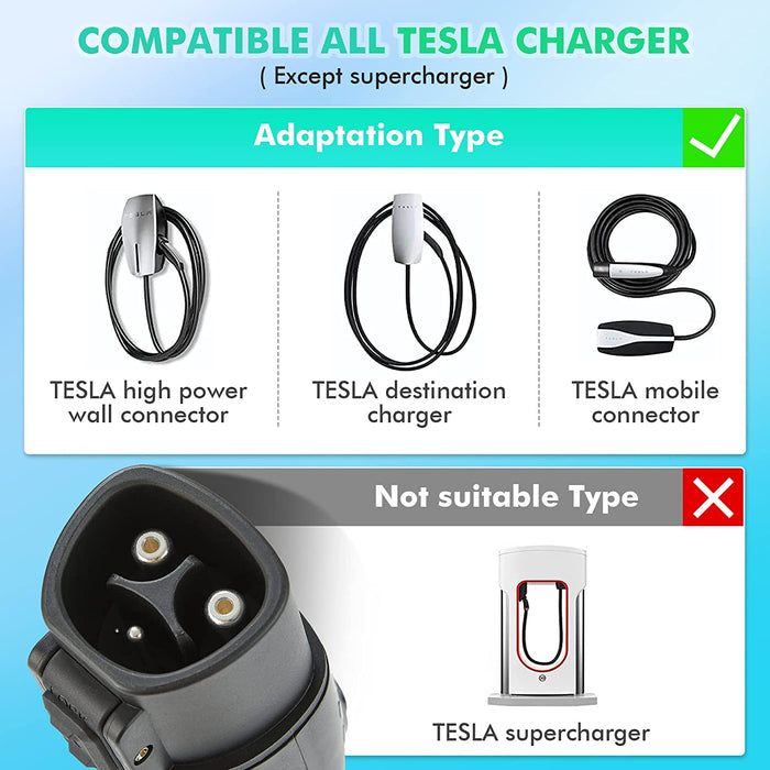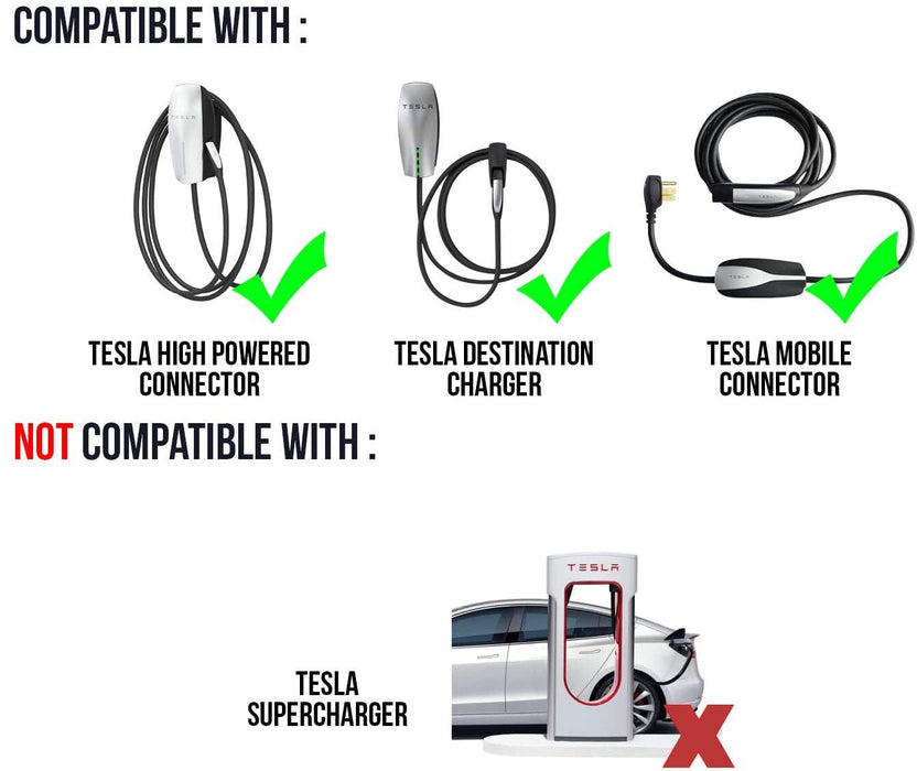 - COMPATIBILITY - Compatible with the Tesla High Power Wall Connector, Destination Charger and Mobile Connector, our adapter greatly increases your number of charging destinations. Note: This product is not compatible with the Tesla Supercharger.