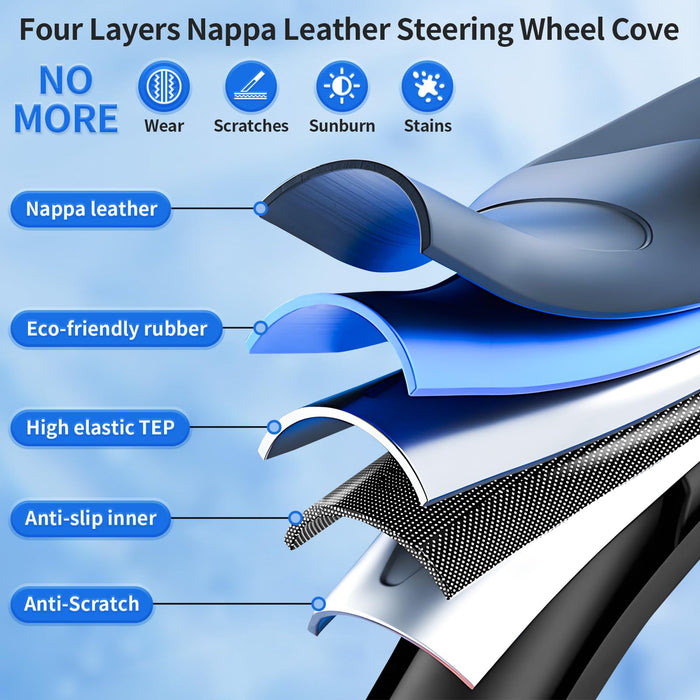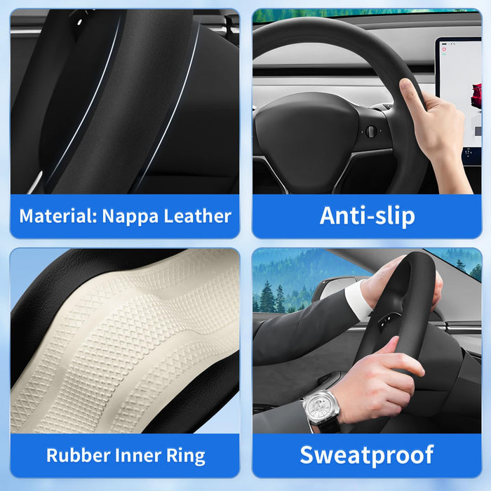 Nappa Leather Steering Wheel Cover for Tesla Model Y Juniper 2025 | Model 3 Highland 2024-2025 | Non-Slip Breathable Matte Black Steering Wheel Protector