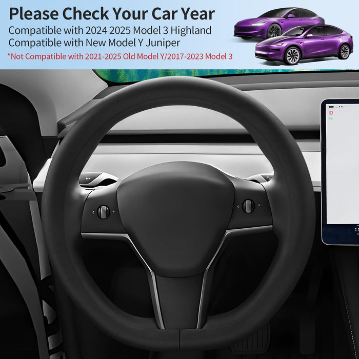 EV Bandit Steering Wheel Cover fits the New Tesla Model 3 Highland 2024–2025 and New Model Y Juniper Refresh Long Range (Rear/All) and Performance models. NOTE: Not compatible with 2021–2025 pre-refresh Model Y. Designed using 1:1 data of the original steering wheel to ensure the best fitment and premium aesthetic. Combines comfort with robust support, offering ultimate relaxation during long drives.